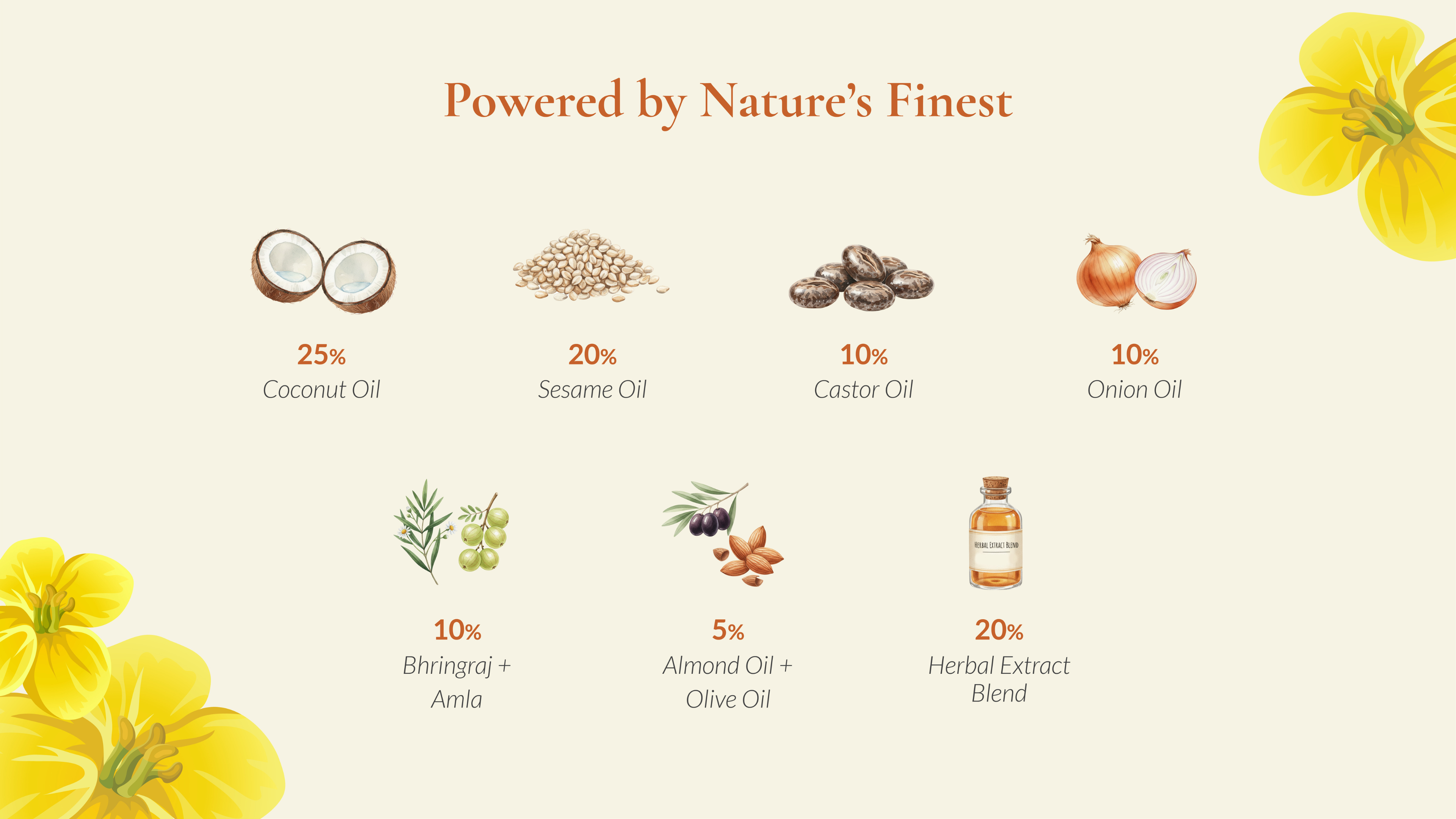 Bhringraj and Amla strengthen roots, reduce greying, and promote growth. Amaaltas Hair Oil blends them with other nou...
